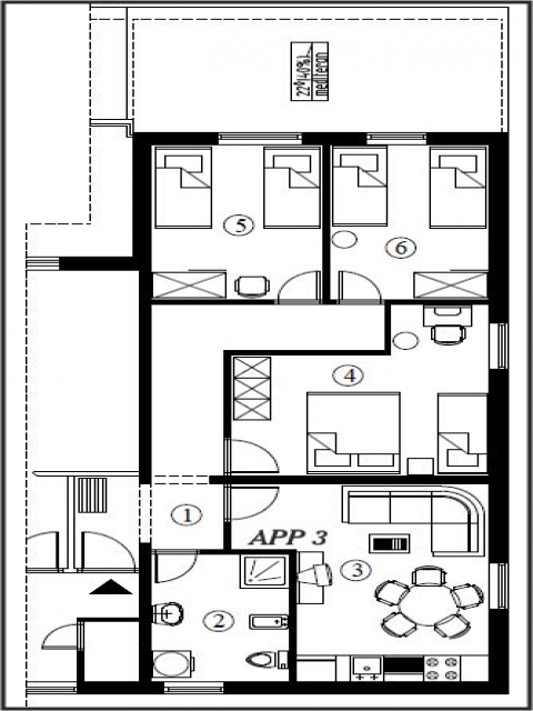 3 spavaće sobe, dnevna soba sa kuhinjom, kupaonica, terasa, P=70 m